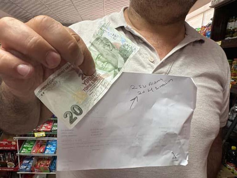 Çeliktopuz, iki şişe su alıp ödeme yapmak için kasaya yöneldiğinde esnafı bulamayınca 20 lira ile kağıda “İki su aldım 20 lira bıraktım.” yazılı not bırakarak ayrıldı.
