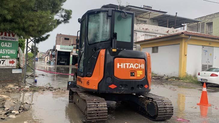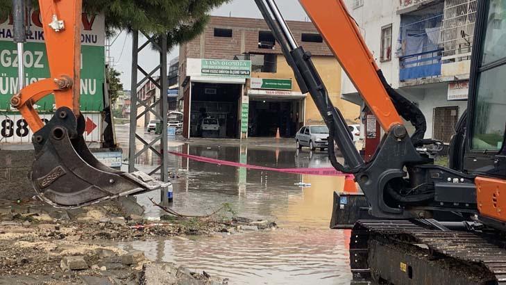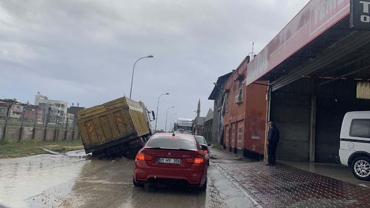 Öte yandan Fevzipaşa Mahallesi 48043 sokakta çok yağış nedeniyle göle dönen yolda bir hafriyat kamyonu çukura saplanarak yan yattı.
