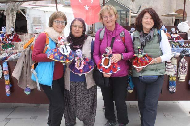 Ayşe Aplak, “Turist dönemimiz çok uygun başladı. İnşallah bu türlü devam eder. Sabah 9’da standa geliyoruz. Turistler geliyor, bebekleri alıyor. Turistler gidince arkadaşlarla birlikte gözleme yapıyoruz, satıyoruz. Sonra konut işlerimizi yapıyoruz. Herkese çalışmayı öneririm. Bayanlar hem bebeğini yapsın hem eşine yardımcı olsun hem çocuklarına baksın” dedi.