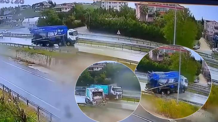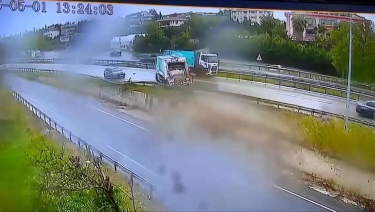 Kaza nedeniyle yavaşlayan trafikte, şoförünün direksiyon hakimiyetini kaybettiği bir çöp kamyonu da yol kenarındaki bariyere çarptıktan sonra kendi etrafında dönerek, gerisinden gelen öteki bir çöp kamyonuna çarptı.