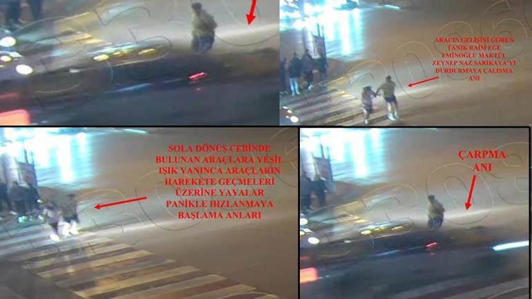 Raporda, Zeynep Naz’ın yayalara kırmızı ışık yanarken karşıya geçmek istediği için ‘asli kusurlu’, Efe Şayık’ın ise ‘üst derece tali kusurlu’ olduğu belirtildi. Raporda ayrıyeten Zeynep Naz Sarıkaya ile yolun karşısına geçmek isterken, aracı fark etmesiyle geri dönen R.E.E.’nin de (17) sözüne yer verildi. R.E.E. keşif günü verdiği sözünde, aracın hızının fazla olduğunu ve fren sesi duymadığını belirterek, “Kaza anında çarpan aracın frene basıp basmadığını hatırlamamakla birlikte, rastgele bir fren sesi duymadım. Yola çıktıktan sonra aracın geldiğini görünce tekrar ışığa bakma fırsatım olmadı. Aracı görünce geri çekildim. Aracın suratının 50 kilometrenin üstünde olduğunu düşünüyorum. Çünkü araç 4×4 araçtır, 50 kilometre süratle çarpsaydı altına alıp sürüklerdi. Lakin kaza anında Zeynep Naz, neredeyse otomobilin üstüne kadar yükseldi. Bana nazaran aracın kaza anındaki suratı 70-80 kilometre civarındaydı” dedi.