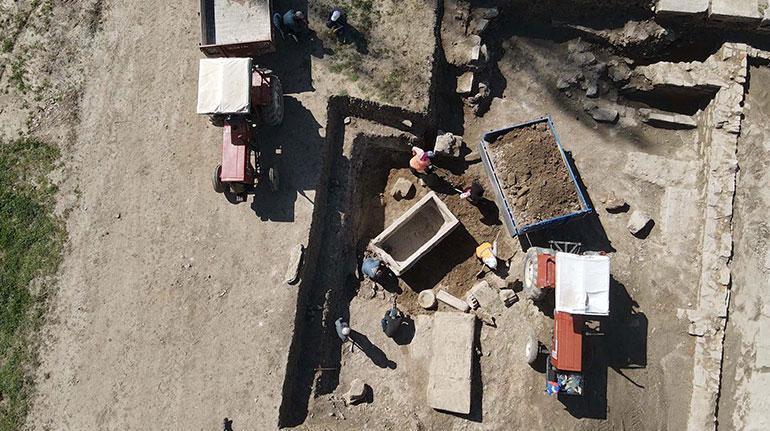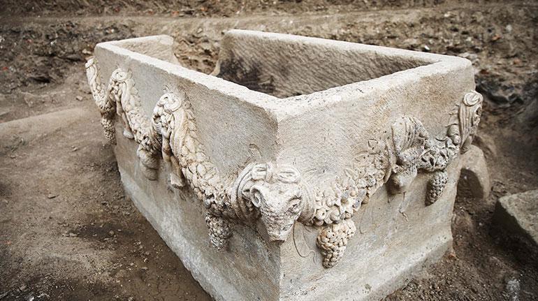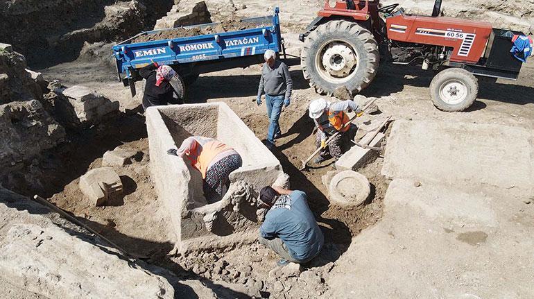 Çalışmaların geçen yıldan itibaren Geleceğe Miras Projesi kapsamında yürütüldüğünü belirten Söğüt, “Bu projelerden birisi de Agora’da (etrafında kamu binalarının bulunduğu kentle ilgili politik, dini, ticari her türlü faaliyetin gerçekleştiği yapı) yürüttüğümüz hafriyatlar. Agorada Geç Antik Çağ Devrini kazıyoruz. Bu alanda yürüttüğümüz hafriyatlar sırasında daha evvel Nekropol’den (kentin mezarlığı) alınıp buraya getirilmiş ve 2 bin yıl öncesine ilişkin girlandlı (meyve, çiçek ve yapraklardan oluşan çelenk) bir lahit bulduk.” dedi.