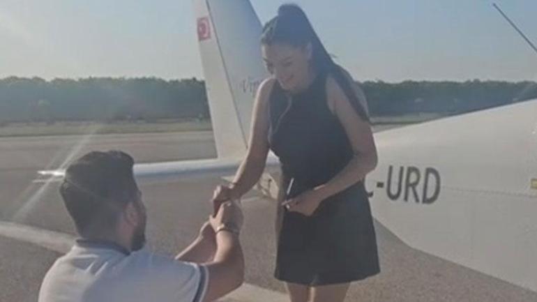 Kentte oto kiralama işiyle uğraşan Metin Topal, vücut eğitimi öğretmeni sevgilisi Sebihe Işık Özerten’e sürpriz evlilik teklifi planı yaptı. Kentteki bir uçuş okuluyla anlaşan Topal, iki farklı uçak kiralayarak gökyüzünde gezinti yaptı.
