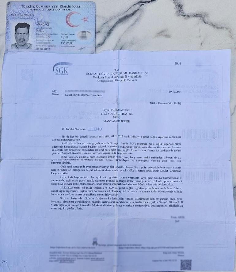Mandacı, “Son olarak 19 Aralık 2024 tarihinde Balıkesir Sosyal Güvenlik İl Müdürlüğü Gönen Toplumsal Güvenlik Merkezi’nden Halil Karaoğlu ismine bir ceza kağıdı geldi. Kelamda sigortalı olarak çalışmışım fakat Halil Karaoğlu ismiyle değil, Halil Mandacı ismiyle. Yetkililer bu durumu, ‘Fark etmez, her iki isim de sensin’ diyerek yorumladı. Artık bu cezayla uğraşıyorum ve ne yapacağımı bilmiyorum. İki kere mahkemeye başvurdum sonuç alamadım. Cezanın ölçüsü 18 bin lira. Daima cezalar geliyor fakat bu durumu nasıl çözeceğimi bilmiyorum. Natürel çift kimlikle yaşamak yerine tek kimlikle yaşamak istiyorum” dedi.