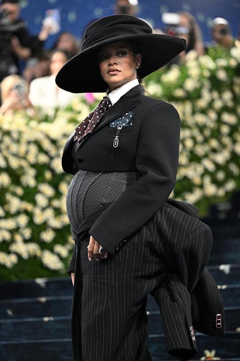 Partneri A$AP Rocky ile üçüncü çocuğunu bekleyen Rihanna ise gri bedene oturan bluz, kravat, kısa blazer ve çizgili etekle büyüyen karnını sergiledi. Üçüncü hamileliğini Met Gala’dan sadece birkaç saat evvel duyuran müzikçi, aktiflik öncesi Carlyle Hotel’de gebe karnını açıkça gösteren bir kombinle görüntülendi.
