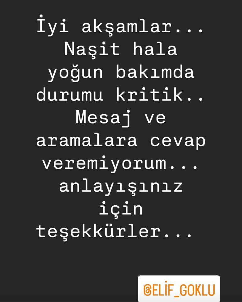 Elif Göklü, oyuncunun şahsî Instagram hesabından son yaptığı paylaşıma “Naşit hala ağır bakımda, durumu kritik. Bildiri ve aramalara yanıt veremiyorum. Anlayışınız için teşekkürler” notunu düştü.