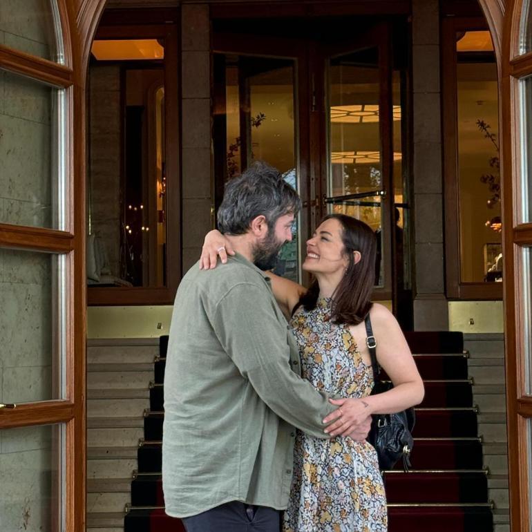 Romantik anlar yaşayan ikiliden ünlü oyuncu, yayınladığı fotoğraflara ”Eveeeeet, 27 Nisan 2025′ notunu düştü.