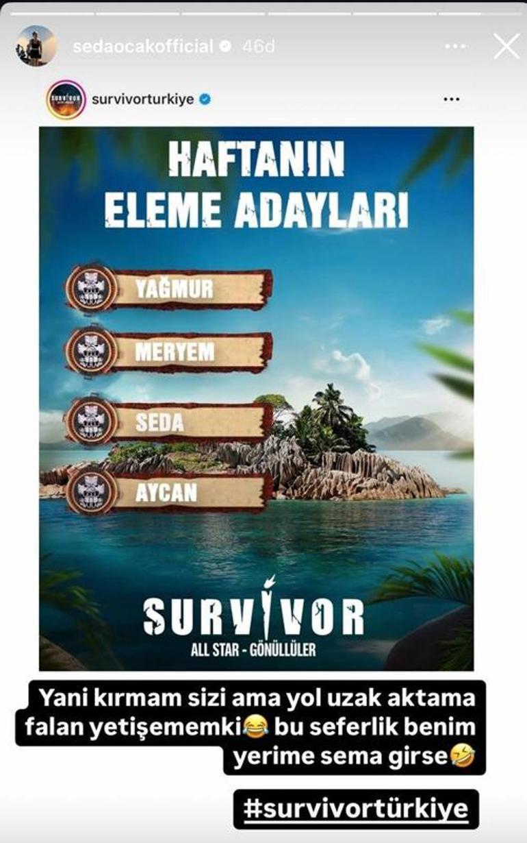 Seda Ocak da Instagram hesabından bu paylaşımı alıntılayarak, “Yani kırmam sizi fakat yol uzak aktarma falan yetişemem ki… Bu seferlik benim yerime Sema girse” yazıp eğlenceli paylaşımda bulundu.