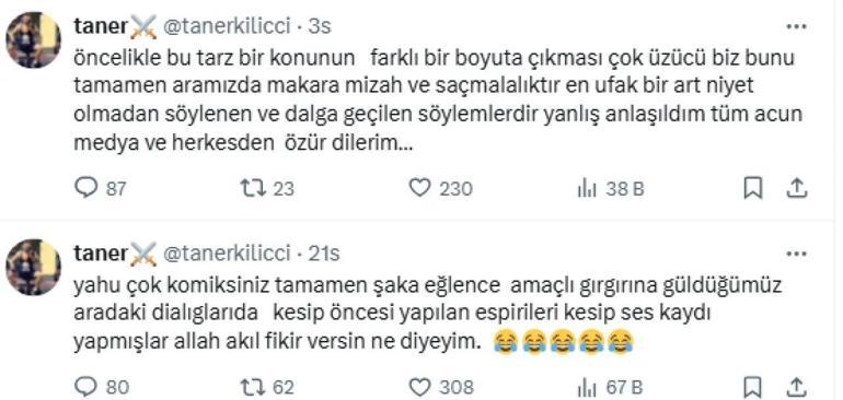 ”Yahu çok komiksiniz, büsbütün latife, cümbüş gayeli, gırgırına güldüğümüz diyaloglardı. Öncesinde yapılan esprileri kesip ses kaydı yapmışlar. Allah akıl fikir versin ne diyeyim. Bu biçim bir bahsin bu kadar farklı bir boyuta taşınması sahiden üzücü. Biz bunu ortamızda makara, mizah ve saçmalık olarak söyledik. En ufak bir arka niyet yoktu. Yanlış anlaşıldım. Tüm Acun Medya’dan ve herkesten özür dilerim.”