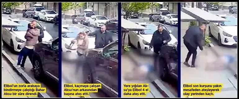 Öte yandan olaya ait güvenlik kamerası imgeleri ortaya çıktı. İmajlarda yolun karşısına geçen Bahar Aksu’nun gerisinden gelen eski eşi Rüstem Elibol’un kolundan tuttuğu bu sırada Elibol’un arkadaşlarının bulunduğu kırmızı renkli arabanın yanlarına yanaştığı ve Bahar Aksu’yu zorla araca bindirmeye çalıştıkları görülüyor. İmgelerde, Aksu’nun araca binmemek için direndiği bunun akabinde eski eşi Rüstem Elibol’un belinden çıkardığı silah ile arka arda ateş ettiği anlar yer alıyor.