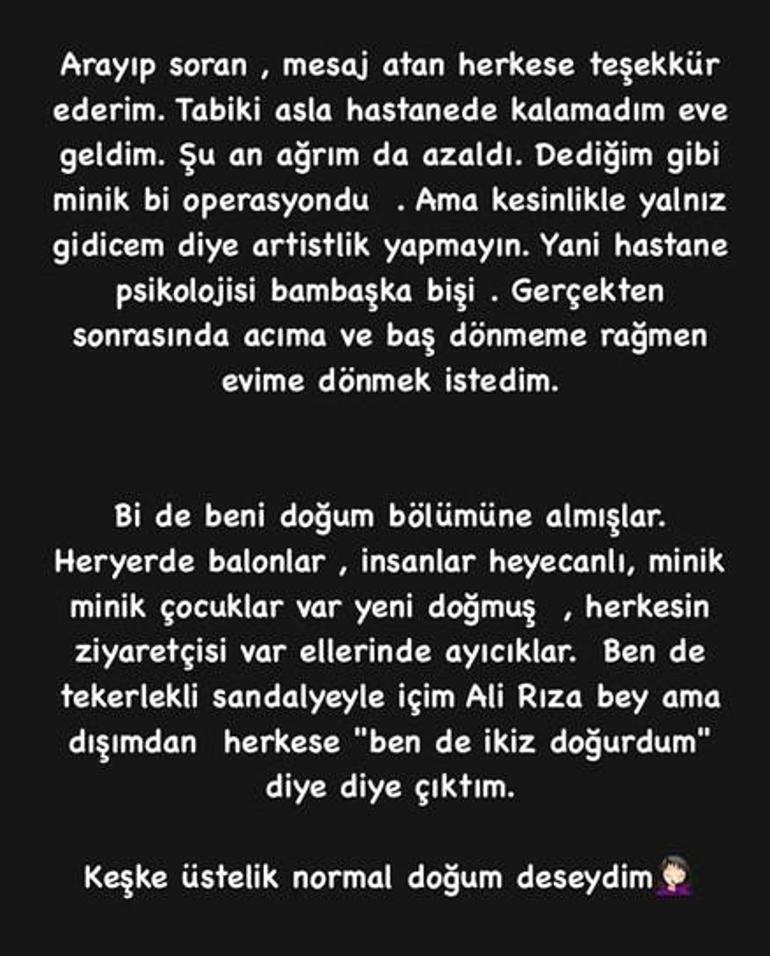 Sağlık durumu hakkında bilgi veren Koçak, Instagram hesabındaki gönderisine “Arayıp soran, bildiri atan herkese teşekkür ederim. Olağan ki asla hastanede kalamadım konuta geldim. Şu an ağrım da azaldı. Dediğim üzere minik bir operasyondu lakin katiyetle ‘Yalnız gideceğim’ diye artistlik yapmayın. Yani hastane psikolojisi apayrı bir şey. Sahiden sonrasında acıma ve baş dönmeme karşın konutuma dönmek istedim.” notunu düştü.